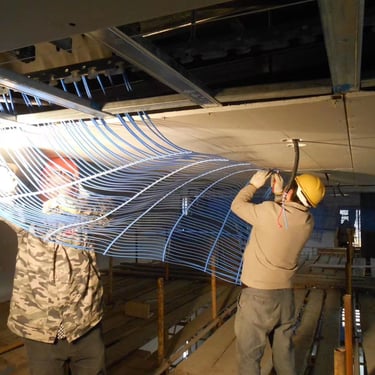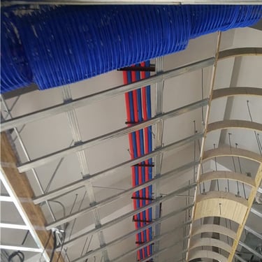 The main supply and return lines installation for the capillary tube mats in the ceiling void.