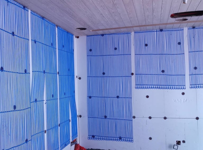 Sinolanc capillary tube mats can be integrated into walls of various designs and used as wall heating and wall cooling. The flexibility of the capillary mats allows them to be installed to all the available conditions. The radiant wall capillary mats are generally carried out using the plaster method or drywall.